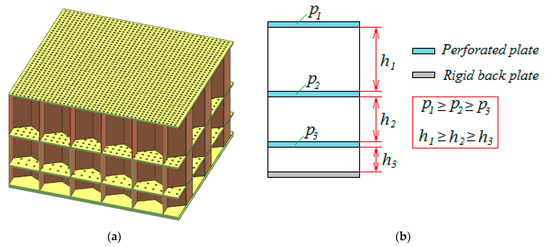 Figure 1. Triple-layer locally reacting liner: (a) Overall view; (b) Geometry of layers; p is perforation degree; h is height of resonant cavity.