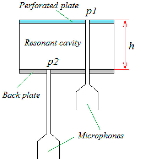 Another method for determination of acoustic liner impedance both on normal incidence impedance tube and on grazing flow impedance tube is the Dean’s method [17]. In contrast to the methods mentioned above, in this approach, microphones are installed in the walls of the resonator’s cover and backing. The method consists of measuring the sound pressure p1 on the front surface of the resonator and the sound pressure p2 on the resonator backing (Figure 2) with subsequent calculation of the normalized impedance by the formula: