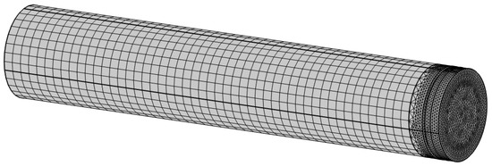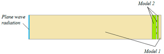 To obtain the values of the acoustic pressure at the resonator cover and resonator backing at different orifice arrangements, a number of computations are carried out. The computations consist of the numerical simulation of the physical process in a resonator installed in a normal incidence impedance tube. A three-dimensional geometric model of the computational domain is the internal volume of the cylindrical resonator, where acoustic processes occur, attached to the tube 150 mm long. On the other side of the tube, plane wave radiation is applied (Figure 3). The inner diameter of the impedance tube is 30 mm; therefore, only a plane wave propagates in the frequency range of interests 500–6000 Hz.
