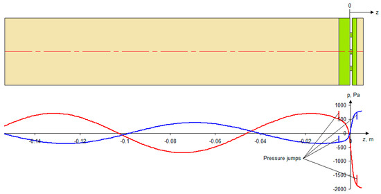 Figure 5. Distribution of acoustic pressure along the symmetry axis of the geometric model at a frequency of 3000 Hz: the red line is the real part; the blue line is the imaginary part; coordinate z = 0 is on the resonator surface.