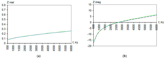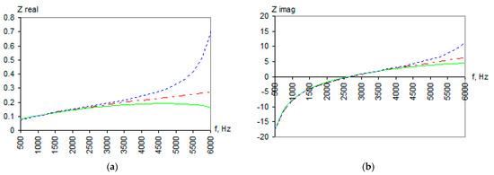 Figure 9. Normalized impedance determined by Formula (4): (a) Real part; (b) Imaginary part; Acoustics 04 00023 i004 Variant 1 of the orifice arrangement; Acoustics 04 00023 i005 Variant 2 of the orifice arrangement; Acoustics 04 00023 i006 Variant 3 of the orifice arrangement.