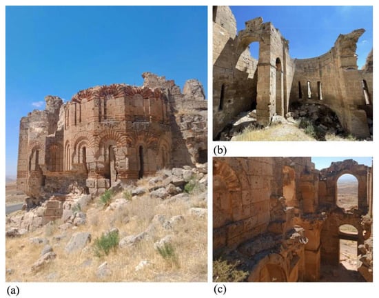 (a) An exterior view of Bell Church; (b) an interior view of the main church space (naos) with three apses; (c) the entrance hallway (narthex) of the church.