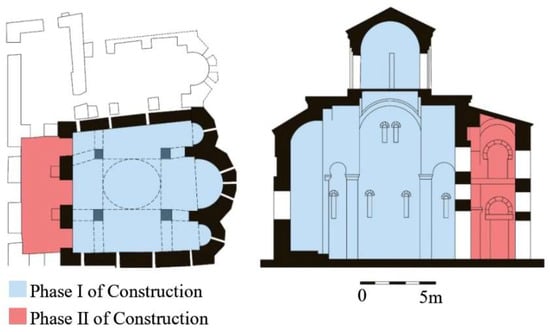 The church was built in three main phases []. Phase I of the church only included the main structure, the naos, which is approximately 9.2 m2, and was constructed in the early eleventh century []. The second phase of the church included a narthex to the south and the north, while during the third phase of the construction, a parekklesion (side chapel) was added to the church []. Figure 3 shows the two main phases of construction on which this study focuses.