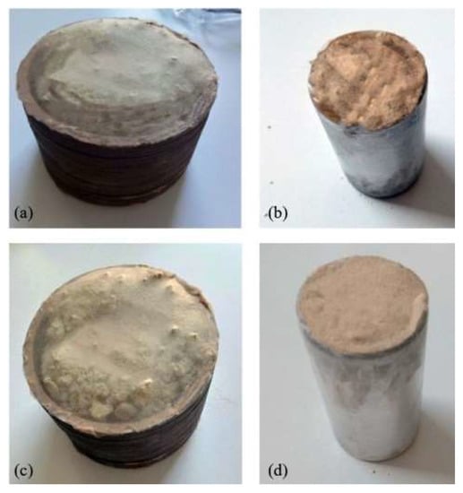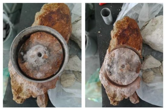 For this study, two types of samples are prepared for each rock, collected from three different areas of the region. For the low-frequency measurements (100 mm samples), rings of cardboard have been stacked to create a mold to hold the tuff stones. The corners of the mold are filled with the same tuff stone to reduce air gaps. For the high-frequency samples (28 mm samples), a steel mold has been filled in with the rock tuff. Since the rock samples are porous, an acoustically transparent piece of cloth has been used on both ends of the mold to ensure that the material stays compact (Figure 5). For the low-frequency setup, the rock samples have been cut to fit in the mold, just like a masonry block. Therefore, the tuff is primarily in the shape that was used in the construction of the rock-cut spaces. However, for the high-frequency setup, fragments of the tuff stone have been put together to fill the mold. The method is considered appropriate due to the presence of air spaces in the porous rock materials. The inability to clearly cut the rock samples for the high-frequency setup is a limitation of this study. Each sample, for both low- and high-frequency setups, has been tested in the tube 10 times to ensure the repeatability and accuracy of the results.