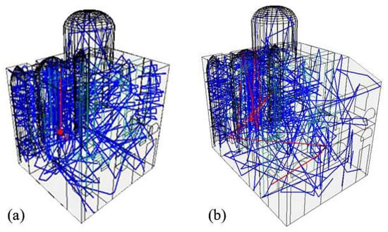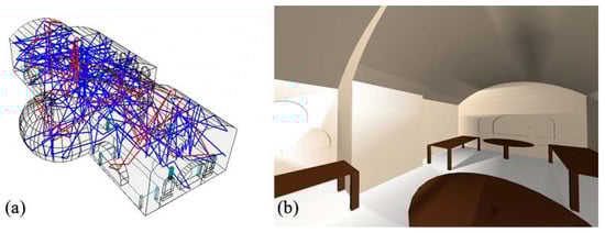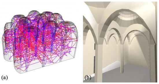 In the simulations of Bell Church Phase I (estimated volume: 975 m3), a wooden screen is added between the apses and the naos to represent an iconostasis []. Therefore, the sound source is placed behind the screen to recreate the acoustical environment during liturgical practices. Figure 9a and Figure 10a show a ray tracing model and a 3D OpenGL view of the church from Phase I.