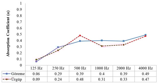 As a result, the two samples from Göreme and Ürgüp are much more porous and softer than the tuff stone from Hallaç, and hence, as mentioned in Section 3.1, impedance tube tests could be performed on the tuff stone samples from Göreme and Ürgüp. The results of the test are discussed as follows.