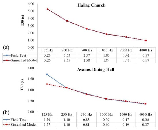 T30 values over 1/1 octave bands of the field test and simulated model of (a) the Hallaç Church; (b) the Avanos Dining Hall. T30 values of both the field test and the simulated model are close to each other along the frequency spectrum.