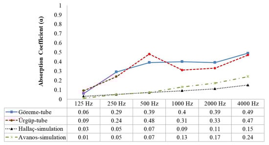 According to Figure 13, among all the materials under study, Göreme has the highest sound absorption, while the Hallaç Church seems to be the most reflective. The sound absorption values of the samples studied with the impedance tests (Göreme and Ürgüp) have an overall higher sound absorption than the materials obtained from the tuning of virtual models (Hallaç Church and Avanos Dining Hall).