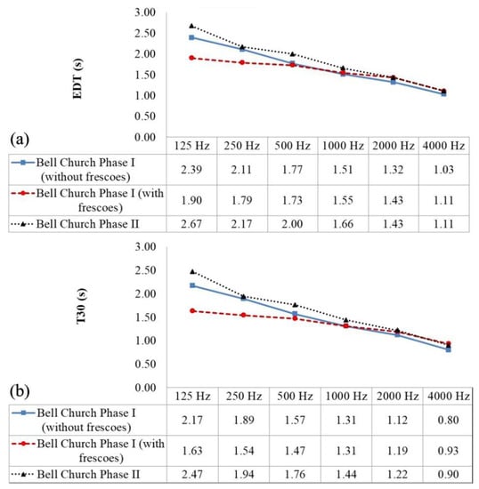 Figure 14 displays EDT and T30 values of the three states of the church. For Bell Church Phase I (estimated volume: 975 m3), an optimum range for liturgical music has been estimated by applying RT = 0.55 × log10(Vol.) − 0.14 []. Accordingly, T30 of 1.5 s over the mid-range frequencies is optimal for liturgical performances.
