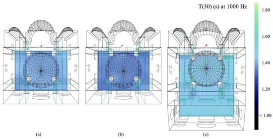 T30 (1000 Hz) distribution maps of (a) Bell Church Phase I (without frescoes); (b) Bell Church Phase I (with frescoes); (c) Bell Church Phase II. There is a fairly uniform distribution of the T30 values over the entire floor of the church.