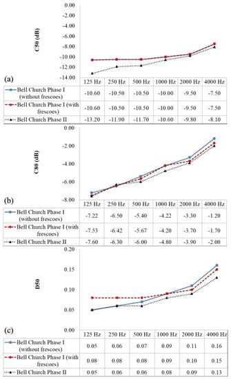 For Bell Church Phase I (with frescoes), negative values of C80 over the whole frequency range are observed. With the addition of frescoes, the church is found to have an approximate C80 of −4.94 dB (Figure 16). The same effect of increasing C80 values with increasing octaves is also observed. Figure 15 also shows low values of D50, with a mean value of 0.09 at mid-range frequencies.