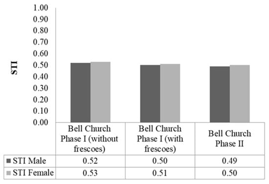 Male and female STIs obtained for Phase I & II of Bell Church. The lowest STI value is 0.49 (STI male, Bell Church Phase II), whereas the highest value is 0.53 (STI female, Bell Church Phase I, without frescoes).