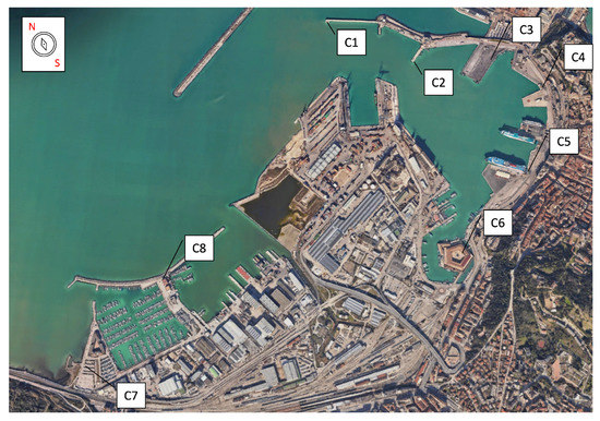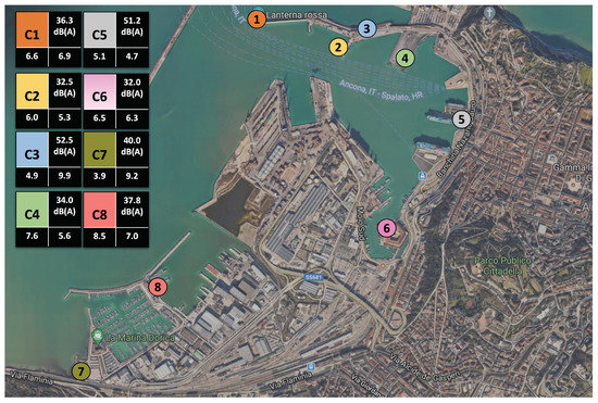 The investigated area is the seaport of Ancona, Italy. The seaport of Ancona is located in the center of the Adriatic Sea. The seaport area is over 1.4 million square meters; it is divided into passenger and ferry terminals, container terminals, and plants for solid bulk; moreover, the seaport area is full of commercial and recreational activities, and it is a meeting point for the community. The seaport has a strategic function in the Adriatic–Ionian macro region, and it is a terminal for international ferry lines to Greece, Croatia, and Albania. This site was selected because it represents a delimited area, and it is frequented by people who use the area every day for different aims. The sound environment of the seaport was considered to be characterized by a variety of sound source types (natural sound, traffic, noise related to industry and machines, and human voices). For the analysis of soundscape, it was decided to consider only the areas of the seaport accessible to the public in order to carry out the investigation as realistically as possible. Therefore, the docks used as building sites or warehouses were excluded. As the seaport has areas with different intended uses, these are split into eight locations that are called: Cluster 1 [C1] (North Pier Area (Red Lantern)), Cluster 2 [C2] (Area of the Clementino pier), Cluster 3 [C3] (Area of the Rizzo pier), Cluster 4 [C4] (Area of the Santa Maria pier), Cluster 5 [C5] (Area of the XXIX Settembre pier), Cluster 6 [C6] (Urban functions area), Cluster 7 [C7] (Sailing area (Doric navy)), and Cluster 8 [C8] (Naval League Area). The selected clusters are shown in Figure 1.
