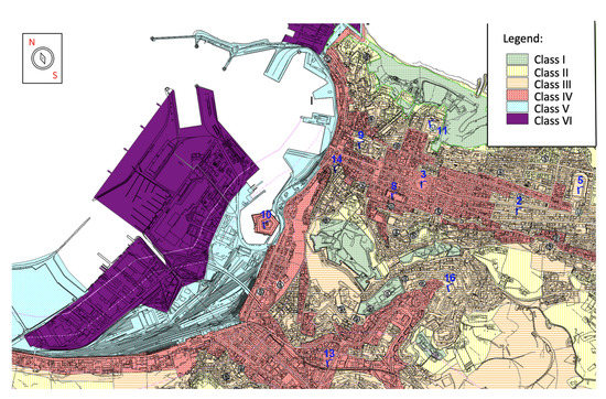 From the acoustic point of view, the interest of the seaport area originates from the diversification of the noise sources presented: goods handling, shipbuilding operations, noise emissions by on-board systems, etc. A further element of interest is the coexistence of an impact on the inhabited environment (noise propagated through the air). The noise of transport infrastructures is governed by Art.11 of L.447/95. The noise produced in the seaport area is not regulated by national specific recommendation, therefore there is great confusion, as the limits are often exceeded, both for the existence of severe acoustic classifications and for the probable overcoming of the differential criteria in the near structures. This insufficiency of conventional methods creates the need to experiment with alternative approaches to environmental management, such as those focused on soundscape. At first, it was necessary to collect information for the geographical and acoustic characterization of the area under examination. Using the technical report on the acoustic classification plan of the Ancona area approved by the Marche Region, information such as the influence of the port area, the acoustic classification, and the measurement points of the noise-monitoring network were collected and examined. As shown in Figure 2, the seaport currently operates within the limits prescribed by the Italian DPCM decree 14/11/97 [38]. In [38], the environmental acoustic classification of areas is explained, as well as the fact that the seaport area of Ancona city includes public land of three classes, these being class IV, affected by vehicular traffic, with high population density, and presence of commercial activities, and classes V and VI, which relate to the industrial zone. Figure 2 shows the acoustic classification of Ancona; the focus is on the seaport zone.