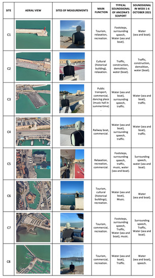 For greater understanding, Figure 3 shows the site plan, the main function, the main sound sources, and the point of measurements for each site. It can be seen that the eight sites showed a wide variation. In terms of function, the clusters included high-traffic areas, areas affected from noise by naval industries, and particularly quiet areas.
