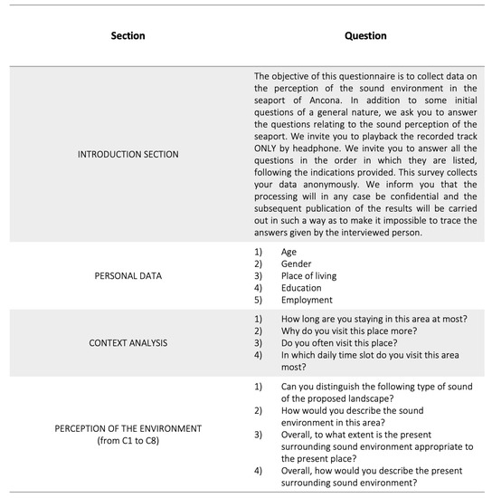 • In the introduction section, the finality and method to compile the questionnaire were explained to the subjects. In particular, most attention was given regarding the modality of the playback of the noise seaport recording. Participants were asked to reproduce the track only with headphones.