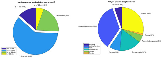 William et al. [8] found that soundscape perception is influenced by cognitive effects such as the meaning of a soundscape and its elements and how information is conveyed by a soundscape; for example, how the behaviors of people are influenced by the soundscape. Furthermore, in the study of Jennings [9], they proposed that the understanding of a public space as positive is quite different for three types of people, each with a different level of direct engagement with the soundscape, such as planners (serious listeners), engineers, and various other humans. The first two are influenced by the soundscape itself, either in meeting legislation and reducing nuisance, or as an artistic or creative opportunity. However the third, probably most important group of people, the users of the space, are more interested in the space itself and have their perception of it influenced by the soundscape, which is a highly complex intermediate step. This influence is largely determined by their activity.