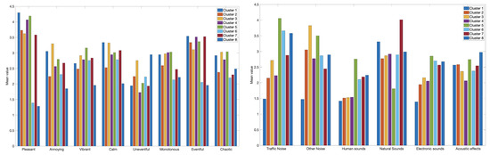 The pie charts highlight the listeners’ attitudes by providing indications of the frequency of the experience of the place, the length of the stay, and above all on the motivation. This will be an important tool to use in dataset normalization. For each cluster, the sensation of noise, in terms of pleasantness/unpleasantness was evaluated. For the same cluster, it was also investigated how much each type of noise was considered to be in agreement with the landscape. The results of this analysis are shown in Figure 6, the trend of the types of noise for all the clusters of interest.