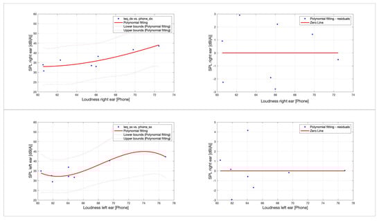 Figure 7. Results of polynomial regression between SPL and Loudness. Several noteworthy results were: (1) right ear r 2 = 0.84; covariance 0.57; and probability 0.001; (2) left ear r 2 = 0.84; covariance 0.56; and probability 0.001.