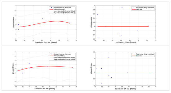 Figure 8. Results of polynomial regression between pleasantness and loudness. Several noteworthy results were: (1) right ear r 2 = 0.87; covariance 0.59; and probability 0.001; (2) left ear r 2 = 0.84; covariance 0.56; and probability 0.001.