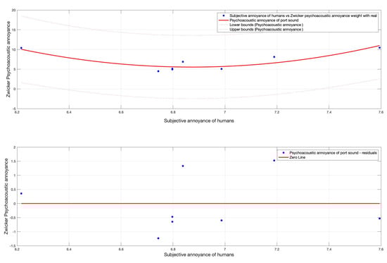 For this study, a Matlab-Code was created, which is capable of calculating the PA once the values of the objective measures have been provided as input. The experimental measurements allowed the determination of acoustic parameters such as sound pressure levels (SPL) and the main objective parameters of psychoacoustics: loudness and relative percentiles, sharpness, roughness, and fluctuation strength. The value of the measures are reported in Table 1 and Table 2. The Matlab routines computed the percentile of loudness, N5, an average fluctuation strength, and ignoring the sharpness, because it was less than 1.75, so it is not a contributing factor. Then, we calculated the W F R , as shown in (9). To analyze the relationship between the overall physical comfort evaluation of an urban open space and the subjective evaluation of various physical indices, as well as the sound level, regression analysis was employed [57,58]. The regression model consists of correlating two or more variables (objective metrics) to the dependent variable (subjective metrics). In this case, the subjective metrics were represented by the results of subjective listening test. The model used for the case study is described in Equations (1)–(5) in our previous work [cite]. From this model, a custom metric was then developed specifically for this case study of a sound quality index (SQI) calculated for each cluster. With the same procedure as determined in the previous equation, a correlation model was proposed to identify the psychoacoustic annoyance related to port noise annoyance. The regression model is explained by the following Equation (10) and shown in Figure 10:
