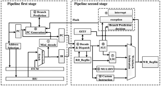 The secondary pipeline mainly includes ID and dispatch (tag 4 in the figure), arithmetic logic operation unit (tag 6 in the figure), memory access unit (tag 7 in the figure), long instruction (tag 8 in the figure), custom instruction (tag 9 in the figure), delivery, and pipeline flushing (tag 5 in the figure). ID and dispatching realize ID of instructions and dispatching related information to arithmetic logic unit (ALU), and ALU unit dispatches specific information to different execution units for execution. One-cycle instructions such as logic operation, addition and subtraction, shift, etc., are handed over to ordinary ALU unit for processing. The branch jump instruction is delivered to judge the prediction, and the prediction error needs to be flushed by the instruction pipeline. The memory access instruction is allocated to the memory loading unit for loading and accessing data. Long-term coprocessor instructions are assigned to coprocessor units for execution.