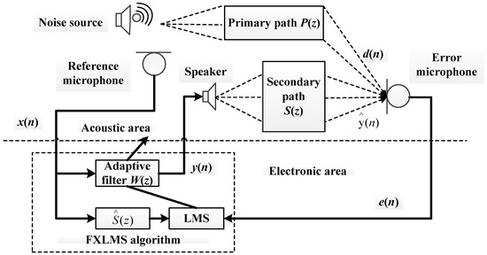The schematic diagram of active noise control system architecture is shown in Figure 2, and the operation processing part is the most classical FxLMS algorithm [14,15,16].