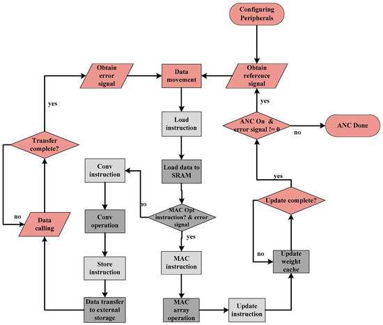 The pink parts in Figure 3 belong to the software flow, of which specific significance is the external acquisition of the ANC system and the configuration of function blocks. Then it includes storing the data at the corresponding address after collection. Subsequently, the light gray part is the related custom instructions. Used for realizing software and hardware interaction between the main processor and the coprocessor, the last dark gray part is the defined hardware acceleration part, which specifically includes the adaptive filtering part in the algorithm corresponding to convolution operation, the weight update part corresponds to the LMS algorithm in the algorithm corresponding to multiplication and accumulation array operation, and the corresponding cache unit used in data handling.
