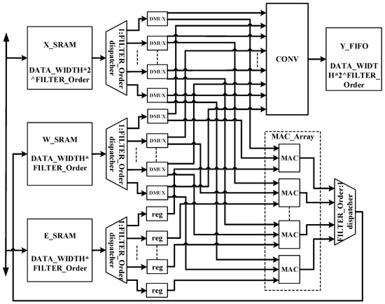 The most critical parts in the accelerator circuit are the one-dimensional convolution operation block and MAC array operation block. The one-dimensional convolution operation block realizes the FIR filtering part of the algorithm, and the MAC array operation block realizes the parallel weight coefficient update. Its circuit structure is shown in Figure 5.