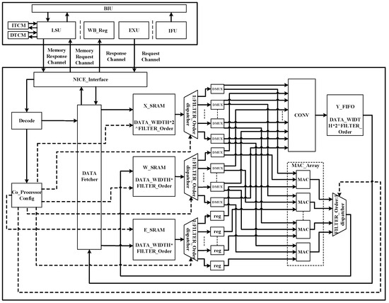 After the operation structure design is completed, the core instruction cooperation unit should be added to expand the coprocessor design, and the decoder, data extractor and configuration enabling function block should be added to complete the hardware design of the audio denoising coprocessor. Its circuit structure is shown in Figure 6.