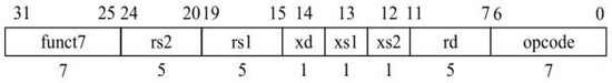 After the software program is burned to the MCU, the main processor obtains the instructions in sequence, decodes the instructions, and judges whether the instructions are custom instructions according to their operation codes. In this design, the operation codes of custom 1–4 defined by RISC-V are used as custom instruction operation codes, and R-type instructions are used for custom instruction coding. Its format is shown in Figure 7.