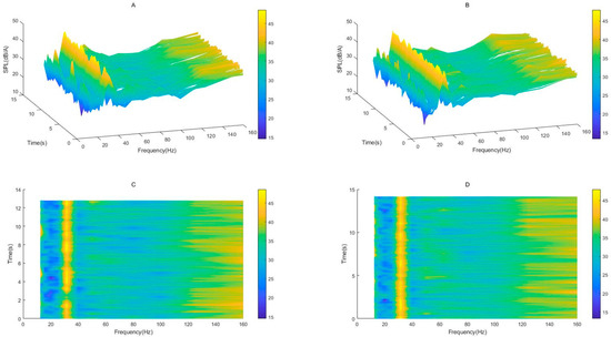 (A) Change in SPL and time within 0 to 160 Hz before noise reduction, (B) change in SPL and time within 0 to 160 Hz after noise reduction, (C) time frequency (0–160 Hz) diagram before noise reduction, (D) time frequency (0–160 Hz) diagram after noise reduction.