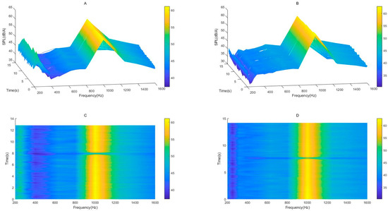 (A) Change in SPL and time within 200 to 1600 Hz before noise reduction, (B) change in SPL and time within 200 to 1600 Hz after noise reduction, (C) time frequency (200–1600 Hz) diagram before noise reduction, (D) time frequency (200–1600 Hz) diagram after noise reduction.