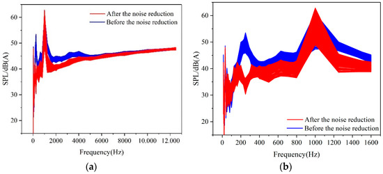It can be seen from the Figure 14A,B that the noise reduction effect is obvious at 200 Hz, the curve changes significantly, and the change trend after 400 Hz is similar. However, since the color code of the three-dimensional graph before and after noise reduction is not consistent, the change cannot be seen directly through the color, so it needs to be analyzed in combination with the coordinates of SPL. The noise reduction effect is about 5 dB in the range of 400 to 800 Hz and about 3 dB in the range of 1000 to 1600 Hz. At the same time, it can be seen from the Figure 14C,D that the time-frequency diagram changes significantly at 200 Hz, from light green in Figure 14C to dark blue in Figure 14D; the noise reduction effect at this frequency point can reach 10 dB. Although the color of 400 Hz in Figure 14C is very deep, the sound pressure level at this frequency point is about 42 dB according to its color code. Although the color of 400 Hz in Figure 14D is lighter than that of Figure 14C, its sound pressure level is also about 39 dB, so the noise reduction effect is quite significant. The noise reduction in other frequency points is similar, so it is not be repeated. It should be noted that when the time coordinate axis in the figure is 8 s, the whole frequency band (200–1600 Hz) has a cliff drop, which is caused by the discontinuity of the test noise itself. Therefore, in the description of noise reduction, this part is not included in the calculation of noise reduction effect.