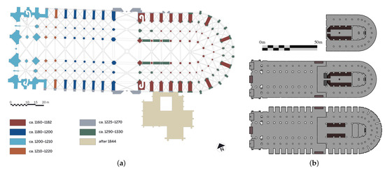Floor plans of Notre-Dame de Paris: (a) with principal phases of construction, from [47]; (b) after the main campaigns, from [49]. From top to bottom: ca. 1182, ca. 1230, ca. 2015.