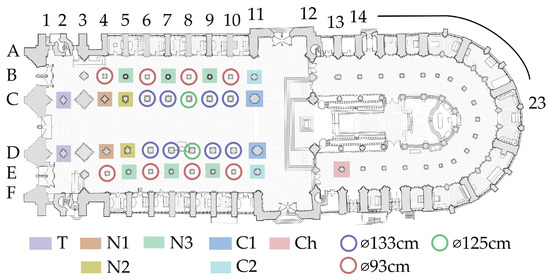 The many successive construction and renovation campaigns can be seen in part through the geometry of the many piers and columns in the cathedral (Figure 1a). The study of the plinths, bases, and capitals contributed notably to the sequencing of the building site [46]. We restrict ourselves here to the study of the scattering properties of the shafts, being the major part of a column. In total, seven geometries were retained according to architectural criteria, such as their location or frequency, and historical criteria such as their place among the different Gothic styles or their links of influence with later or earlier architectural styles. The groups of columns they define are shown in Figure 2 with a label attributed to each. There are five compound piers, consisting of a core flanked by engaged columns and/or pilasters. These elements extend the arches and ribs to take some of their loads and articulate the structure vertically. These principles were already used in Romanesque architecture [54,55]. Their section is formed of a single closed shape. This distinguishes them from the piers with colonnettes, where long thin en-délit circular columns flank without contact with a central part, in this case, they have a decorative function; two were selected. They are all located in the nave, except one. The columns with circular sections present in this part of the cathedral are also indicated in Figure 2, with their diameters. The piers that are not included in the current study, i.e., not colored, are generally formed with shafts of similar geometries, some of which are visible in [48].