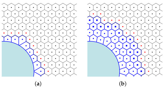 Examples of hybrid meshes in proximity to a curved boundary. (a) Voronoi diagram of grid points enclosing the boundary. (b) Centroidal Voronoi diagram after 10 iterations of Lloyd’s method. Voronoi cells are shown with blue edges, and their corresponding generating sites with blue dots and square. They are clipped by the boundary of the object shown in cyan, and bounded in the outer direction by the regular grid points enclosing them, shown with red dots. Regular hexagonal grid is shown in black.