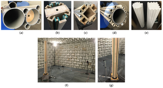 The scattering of the different geometries was measured experimentally by a subtraction method with scale models. They are, for the most part, made of an assembly of long rigid PVC tubes and/or dense wooden boards and cleats, as shown in Figure 5a–d. The detached colonnettes are positioned at the right distance from their core with the help of wedges. Their total length is about 2 m. Both models of compound piers with clustered engaged shafts are made of staff, a plaster-based material. The fresh material is spread in successive layers with a comb whose shape is the negative of one symmetric part of the section. These parts are eventually attached together to form the cylinder, as shown in Figure 5e. Those are 1 m long. Their scaling factor, given in Table 1, is determined by the manufacturing constraints, i.e., according to the standard dimensions of the PVC tubes and wooden cleats, and for those in plaster, it is chosen as a compromise between the size and weight of the model and the minimum size required by the technique to achieve the details.