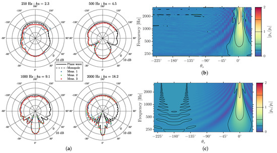Measured scattered fields (3 repetitions) for a rigid circular cylinder compared to analytic solutions in frequency domain. (a) Polar diagrams of relative scattered pressure level, , as functions of the scattering angle at different central frequencies of octave bands with the corresponding Helmholtz numbers indicated, where k is the wavenumber and a the radius. Magnitude ratio, , from (b) measurements (Meas. 3) with scaled frequency, and (c) analytic solutions for plane wave incidence.