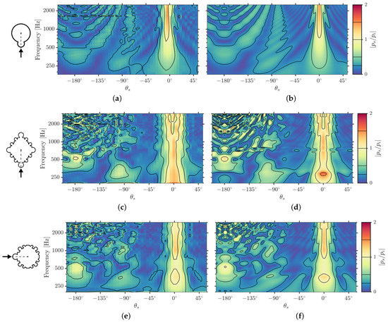 In addition to the error due to the nature of the incident field, other sources are that, for some configurations, the centering of the cylinder and the perpendicularity of the measurement plane to the cylinder axis are not perfectly achieved. For this latter, a part of the wave is thus scattered out of the plane corresponding to oblique incidence. This can be seen when the measured backscattered and forward scattered pressures do not exactly match the expected diametrically opposite directions ° and °, respectively, that are supposed to be symmetry lines in the figures for such configurations as shown in the simulated results. This is particularly striking in Figure A1e compared to Figure A1f, where the cylinder is probably leaning in the transverse direction. If the cylinder is slightly tilted forward or backward from the source, then it is not visible in this way, but the deflection is still present.