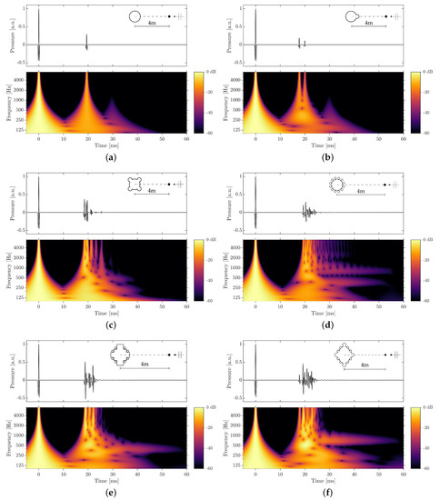 Figure 8 shows the simulated pressure signals at 4 m from the centroid of six different piers in the backscattering direction, and their wavelet scalograms in dB, where each scale has been normalized by the maximum value obtained for the incident pulse. The continuous wavelet transform has been performed using the function cwt implemented in the Wavelet Toolbox version 5.5 of MATLAB 2020a. It has been computed using Morse wavelets, which can be expressed in the frequency domain