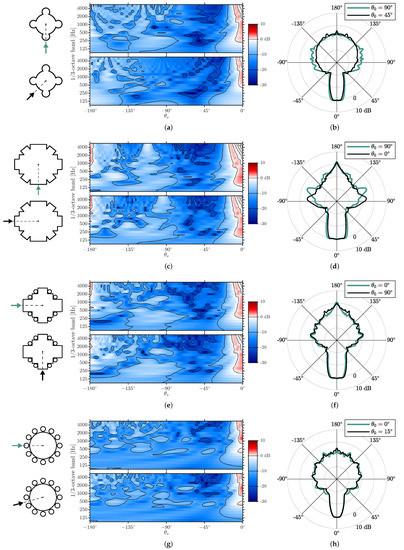 Another one is the geometrical differences that can exist between a hand-made physical scale model and a perfect numerical model. For geometries with outward or inward corners, the scale models will have rounded corners compared to their digital counterparts, where no rounding was introduced afterwards. The effect of rounding corners on the scattered field by concave cylinders with one, two, or four corners has been studied numerically in [80], and they found that maximum differences occurred in the backscattering region with expected dependencies on the radius of curvature, the wavelength, and the angle of incidence, with respect to the position of the corners. Here, the scale models made of staff (Figure 5e) have more rounded edges compared to the wooden models, because of the viscosity of the material having a surface tension, and also affecting both the outer and re-entrant corners. For manufacturing reasons, the angles existing at the intersections of the circles for N2 and N1 (Figure 5a) are also rounded. In addition, for geometries with several elements, a bad straightness, and therefore, the positioning of the small cylinders leads to a different scattering, such as in Figure A2e in comparison to Figure A2f.