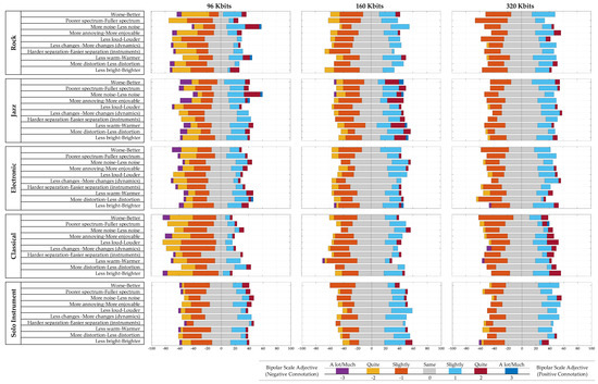 Comparisons of results between genres for different bitrates are presented in Figure 2. Diverging stacked bar charts [51] are used, which are suggested to be appropriate for the presentation of rated scales such as semantic differential [52,53]. The advantages of diverged stacked bars over other graphical forms for rating scales are presented in [53]. The percentages of respondents who agree with the statement are shown to the right of the zero line; the percentages who disagree are shown to the left. The percentages for respondents who neither agree nor disagree are split down the middle and are shown in a neutral color. Results are presented for different bitrates (96 kbps, 160 kbps and 320 kbps) and for different genres (rock, jazz, electronic, classical and solo instrument).