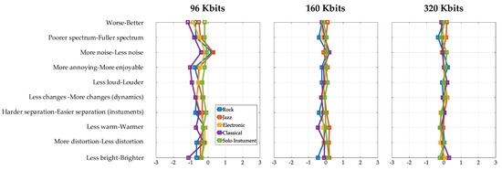 In addition, for convenience, average evaluation scores are also presented in Figure 3 and Figure 4. The data of the rating for the semantic differential method are ordinal; however, it is common practice to average the evaluation results to be presented in similar studies (e.g., [54,55]). Average evaluation scores are presented in Figure 3 for different bitrates (96 kbps, 160 kbps and 320 kbps) and in Figure 4 for different genres (rock, jazz, electronic, classical and solo instrument). Additionally, average evaluation scores are presented in Appendix C in tables for different bitrates. The reason for the additional presentation is that the differences in the case of higher bitrates (e.g., 320 Kbits) are very small and difficult to distinguish in Figure 3 and Figure 4.
