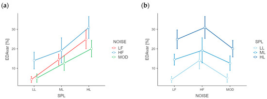 39] was linked to the Arousal of the individuals and their stress levels. It is expected that activation of noise sources induces an increase in the electrodermal activity of the baseline by 5% to 30%. EDA variation increases from one to three times the value at Low and Medium levels at High levels.