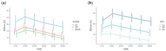RR intervals and EDA were analyzed using LabChart 8 software for each of the three levels of the factor NOISE (LF, HF and MOD) and the factor SPL (LL, ML and HL). The data were averaged in six 10 s intervals (0–10; 10–20; 20–30; 30–40; 40–50; 50–60). The percentage variation (%) from the baseline values before the audio stimulus was then calculated.