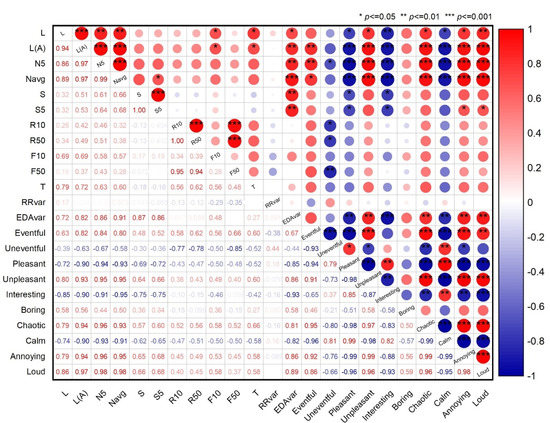 The Pearson correlations between the average values obtained from the subjective rating, psychoacoustics metrics and the physiological measure of EDA and RR interval variation at the nine conditions are shown in the correlation matrix of