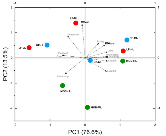 Table 2) showed that the first two perceptual components can explain about 90.1% of the variance, describing mainly two dimensions of the noise perception that can be associated with the concept of Valence (76.6%) and Arousal (13.5%). In particular, while the RR interval increases are associated mainly with Arousal dimension, the results show that, the EDA increases are positively correlated with Loud, Boring, Unpleasant and Annoying noises. Biplot graph of