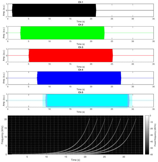 Consequently, an overlapped sweep framework was implemented, which has seen recent success in binaural measurement procedures [,]. In this process, multiple sources are excited in each measurement pass, with each source emitting an ESS with a short interval between each consequent activated sweep as shown in Figure 2. When the resultant recording is deconvolved, the impulse responses line up one after the other at a time equal to . For this, must be at least greater than the reverberation time of the room or else the tail from one RIR measurement will run into the direct sound of the consecutive one. Furthermore, if the loudspeakers are overdriven into harmonic distortion, then the harmonic distortion products will manifest as a series of impulse responses before the direct sound of each of the RIRs. Consequently, must therefore be big enough to ensure that any harmonic distortion products from each impulse response do not manifest in the reverberation tail of the preceding impulse response.