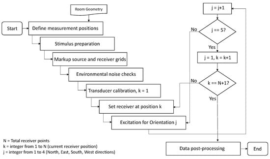 A summary of the measurement process for each room is shown in Figure 3. In general, measurement positions are first defined using architectural plans or geometric measurements. The excitation stimulus is then prepared offline ready for playback to the loudspeakers. The source and receiver points are then physically marked up in the space and any environmental noises that can be eliminated are checked. Loudspeakers and microphones are then calibrated and the measurement routine begins. Once all measurement points have been collected, data post-processing can be implemented.